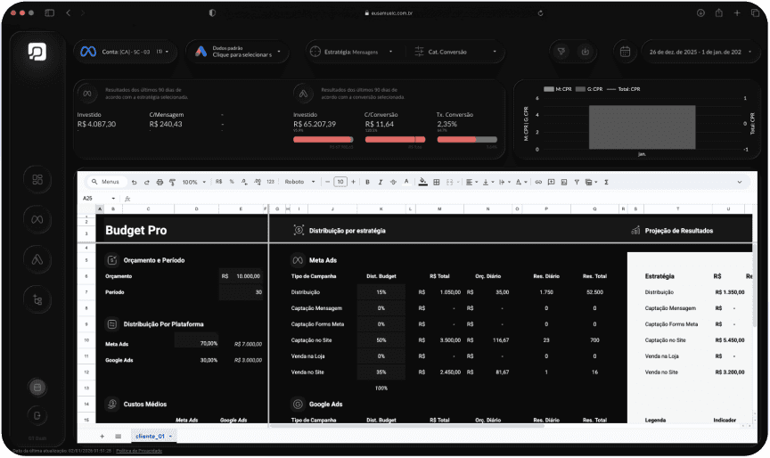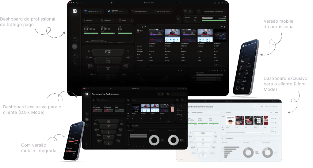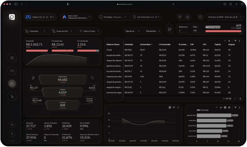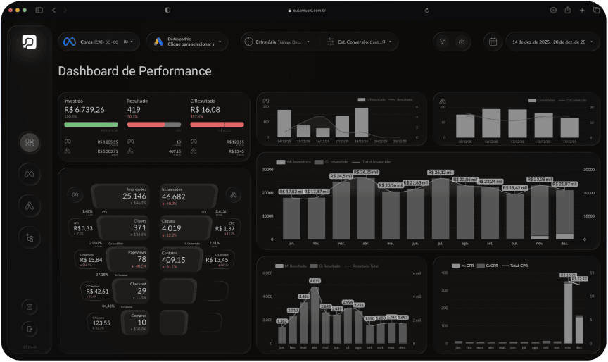 Dados combinados do Google Ads e Meta Ads, em uma estrutura premium, profissional que proporciona total clareza e segurança para você tomar as melhores decisões, otimizar suas cmapanhas e escalar resultados mais rápido.